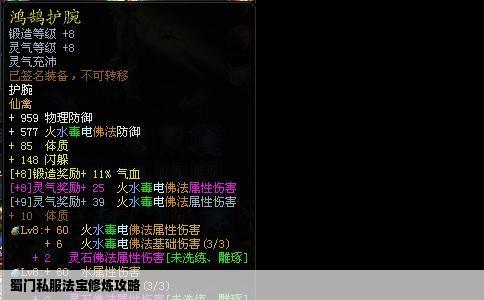 在蜀门私服游戏中,法宝的修炼是提升角色战斗力的重要一环。本文将详细介绍如何有效地修炼法宝,帮助玩家在游戏中取得更好的成绩。法宝修炼基础1. 法宝选择:玩家需要根据自己的职业和游戏风格选择合适的法宝。不同的法宝具有不同的属性和技能,合理选择能更好地发挥角色特点。 2. 修炼材料:修炼法宝需要消耗...